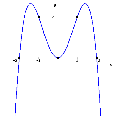 Find a formula for the polynomial of least degree that is graphed below. The graph has -intercepts and goes through the points and .