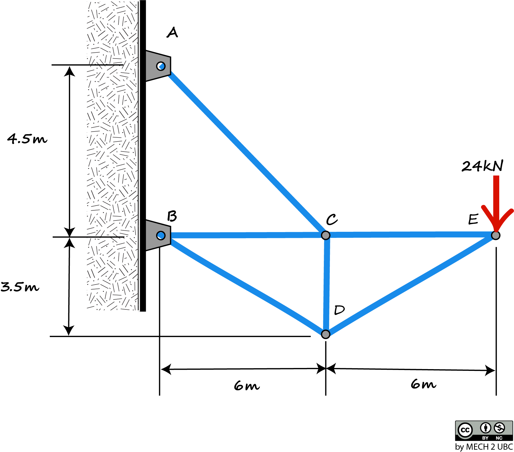 Find the force in member CE for the pin-jointed structure below. (by convention: positive indicates tension, negative indicates compression)