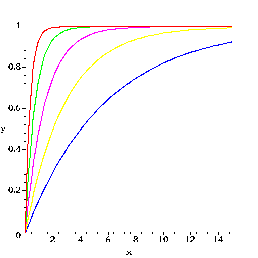 The figure above shows the graphs of four exponential functions, listed below. Match the functions with the colors, using b for blue, r for red, g for green, p for purple, and y for yellow.